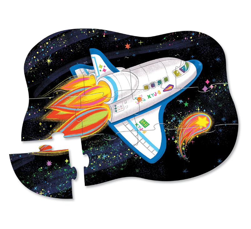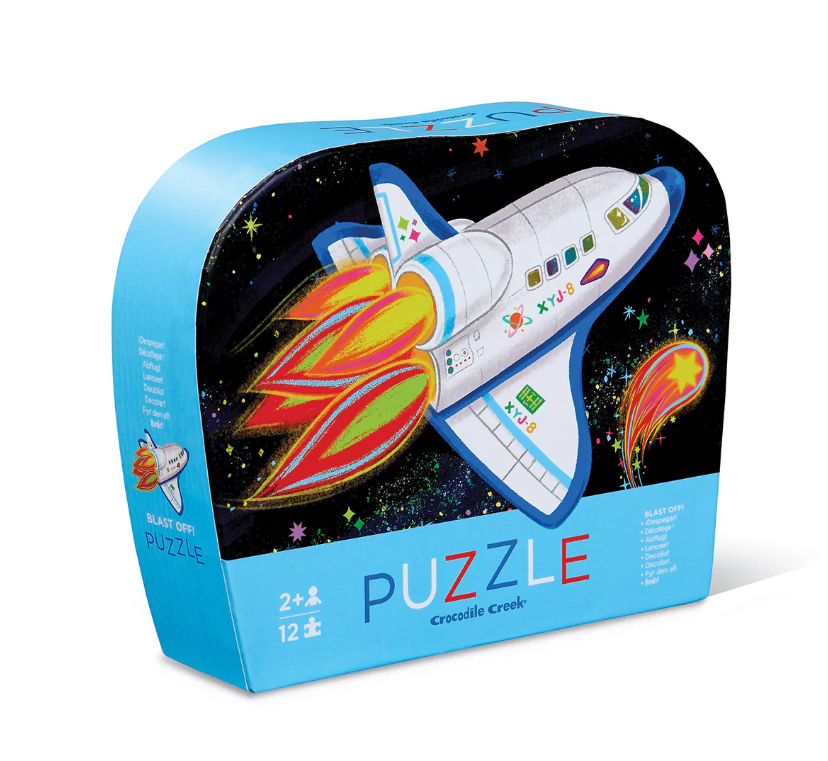 Crocodile Creek Blast Off 12-piece jigsaw puzzle will delight any child interested in outer space! Whimsically illustrated with a Space Shuttle flying through the galaxy! This beginner puzzle encourages hand-eye coordination and problem solving. Great for interaction between a parent and child that can be used over and over. Sturdy box makes for easy storage and small size is perfect for travel.