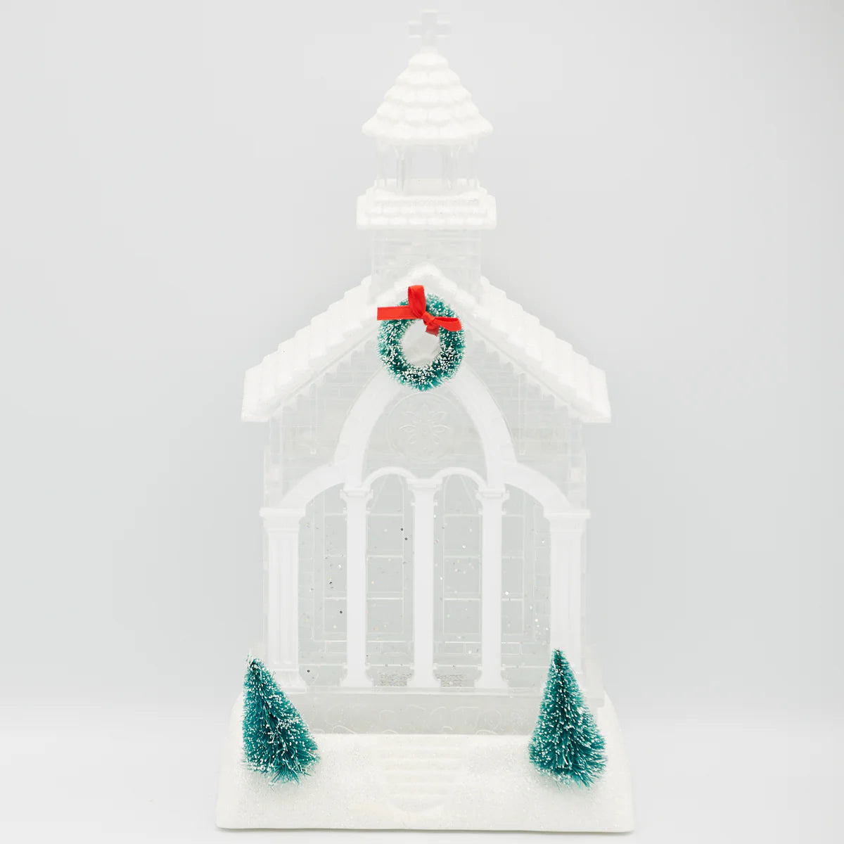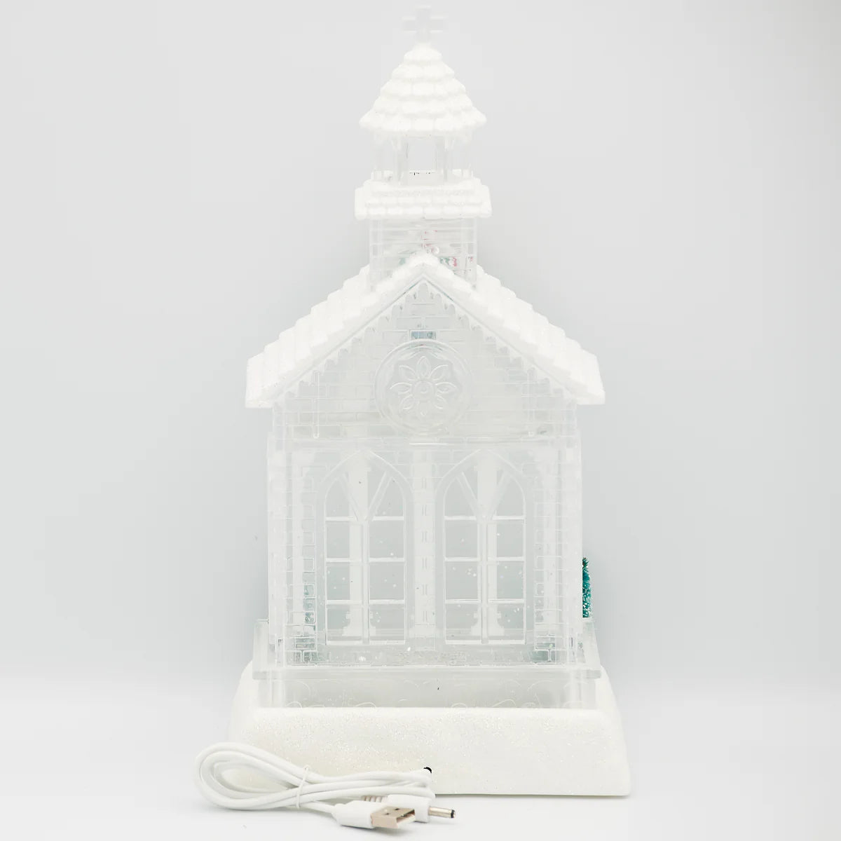 Celebrate the season with this illuminated swirl church featuring a green tree and festive wreath. The gentle glitter movement and warm light bring a peaceful charm to your holiday display.