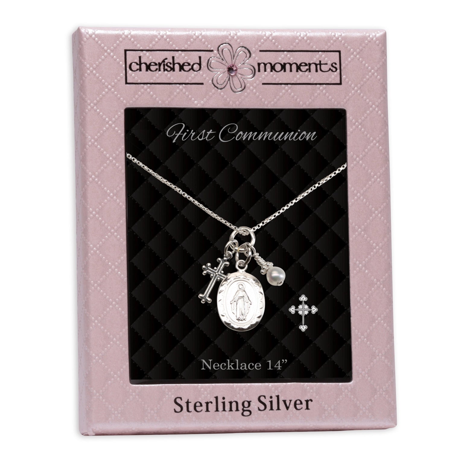 Sterling Silver First Communion Gift with "Miraculous Medal" necklace accented with a dainty cross charm and pearl charm. This floats on a 14" sterling silver Italian chain. Perfect baptism, first communion or confirmation gift for girls. Necklace comes in a beautiful black/pink gift box. A keepsake she will treasure forever! This comes packaged on a special first communion card making it an extra special keepsake for her special day.