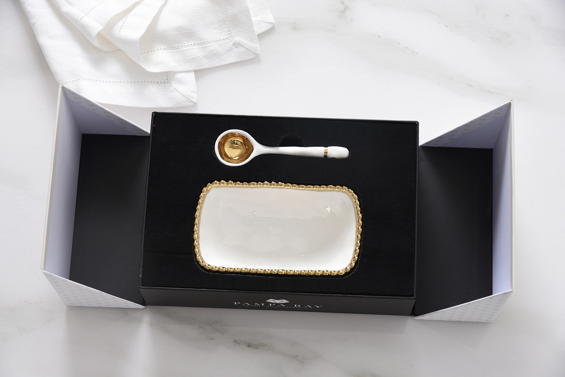 Ideal for all gifting occasions or to gift to yourself! Beautifully packaged in a gift box with a fun sentiment on the inside cover that can be personalized. Great for serving candies, nuts, fruit or condiments! Both bowl and spoon made of gorgeous white porcelain with gold beaded trim and accents. Food safe, tarnish free, dishwasher safe, oven safe to 550°. Easy Care.