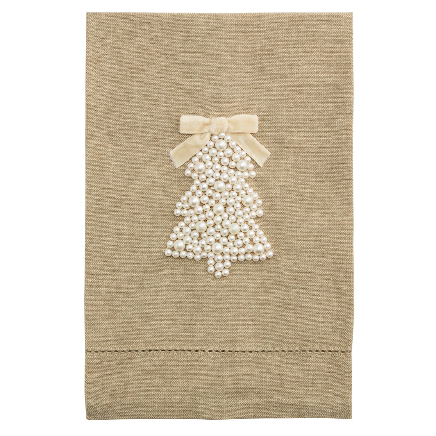 Elevate your holiday decor with this exquisite Christmas Tree Pearl Towel. Crafted from 100% cotton, this chambray hand towel combines elegance and functionality, making it a perfect addition to your festive home. Measuring 21" x 14", it features a stunning pearl bead appliqué that adds a touch of sophistication to any setting. The luxurious velvet bow enhances its charm, while the delicate hem stitching provides a refined finish.