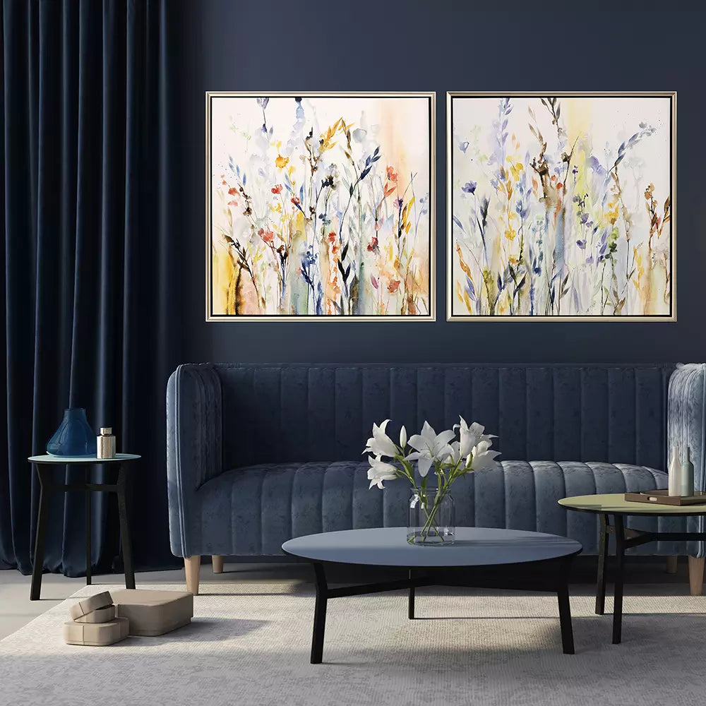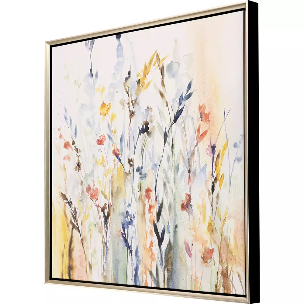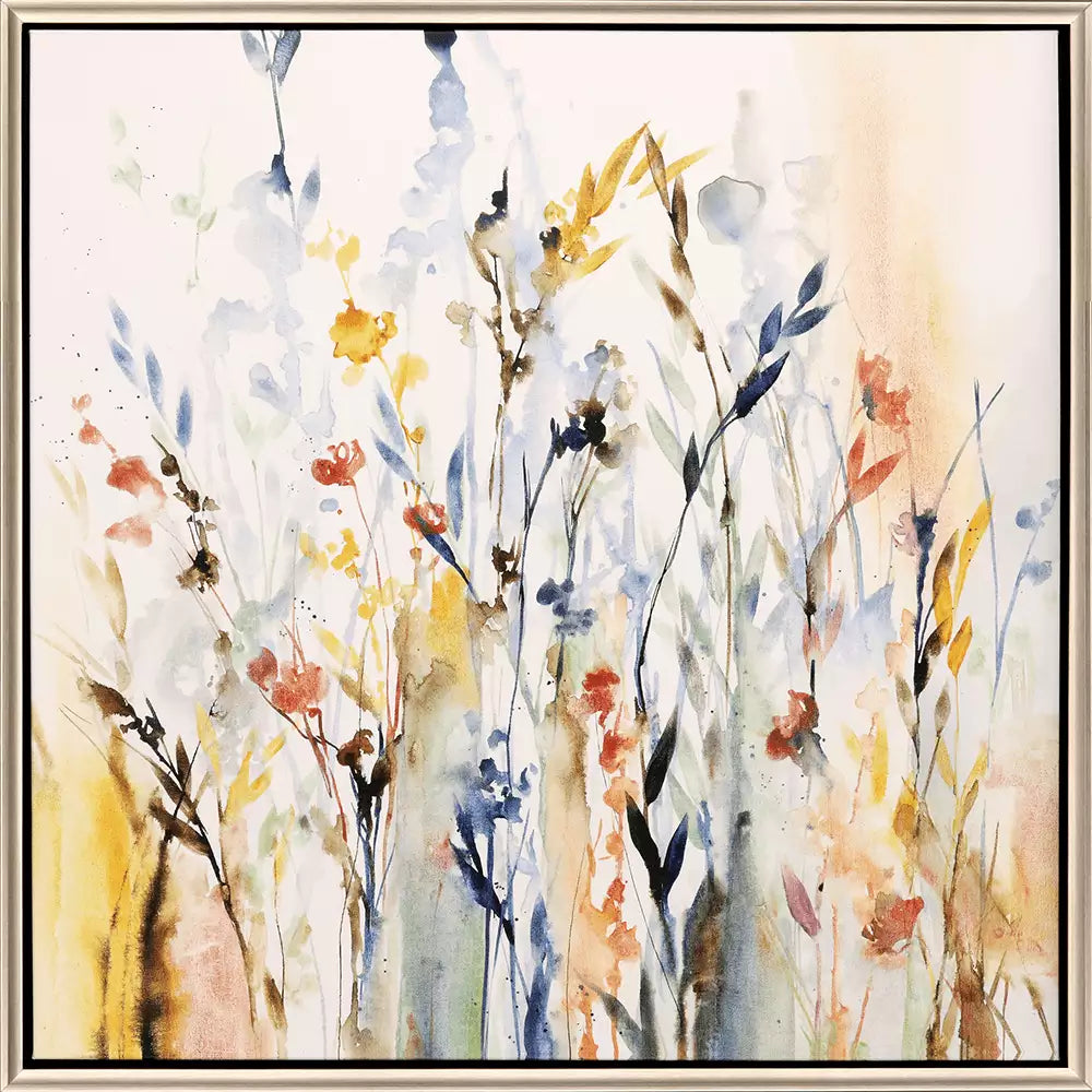 A transitional flower garden blooms in a kaleidoscope of color. Canvas is mounted in a warm silver floater frame with satin black side.