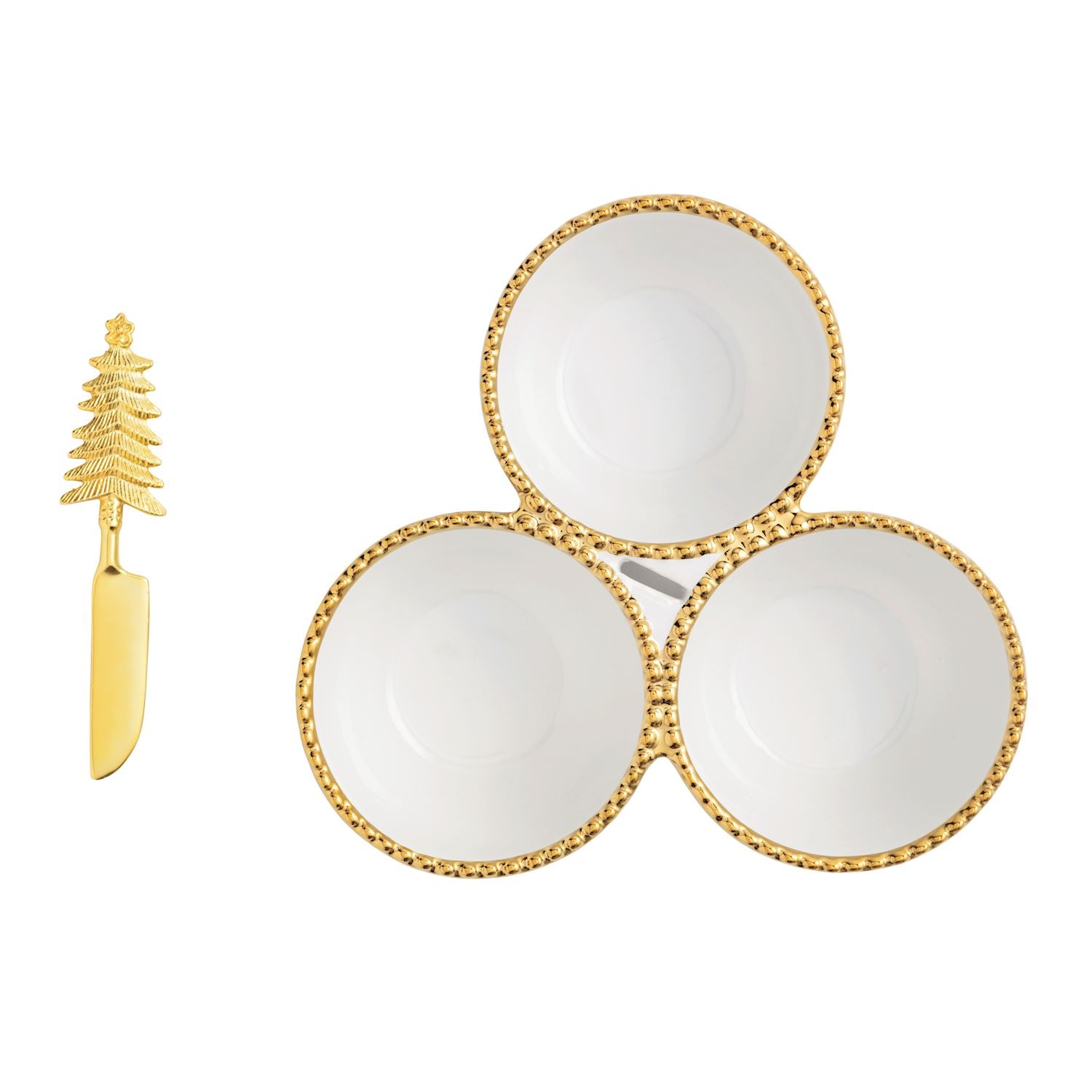 This 2-piece set includes a beautifully crafted mottled ceramic triple dip server, designed with exquisite electroplate beaded edges that add a touch of sophistication to your table setting. The server features a center groove specifically designed to hold the accompanying gold cast aluminum tree spreader, ensuring a seamless and stylish presentation. Measuring 5 inches by 9 inches, the server provides ample space for serving a variety of dips, sauces, or condiments, making it perfect for entertaining guests or enhancing everyday meals. The spreader, at 5 1/2 inches, is crafted for ease of use and complements the server with its elegant design.