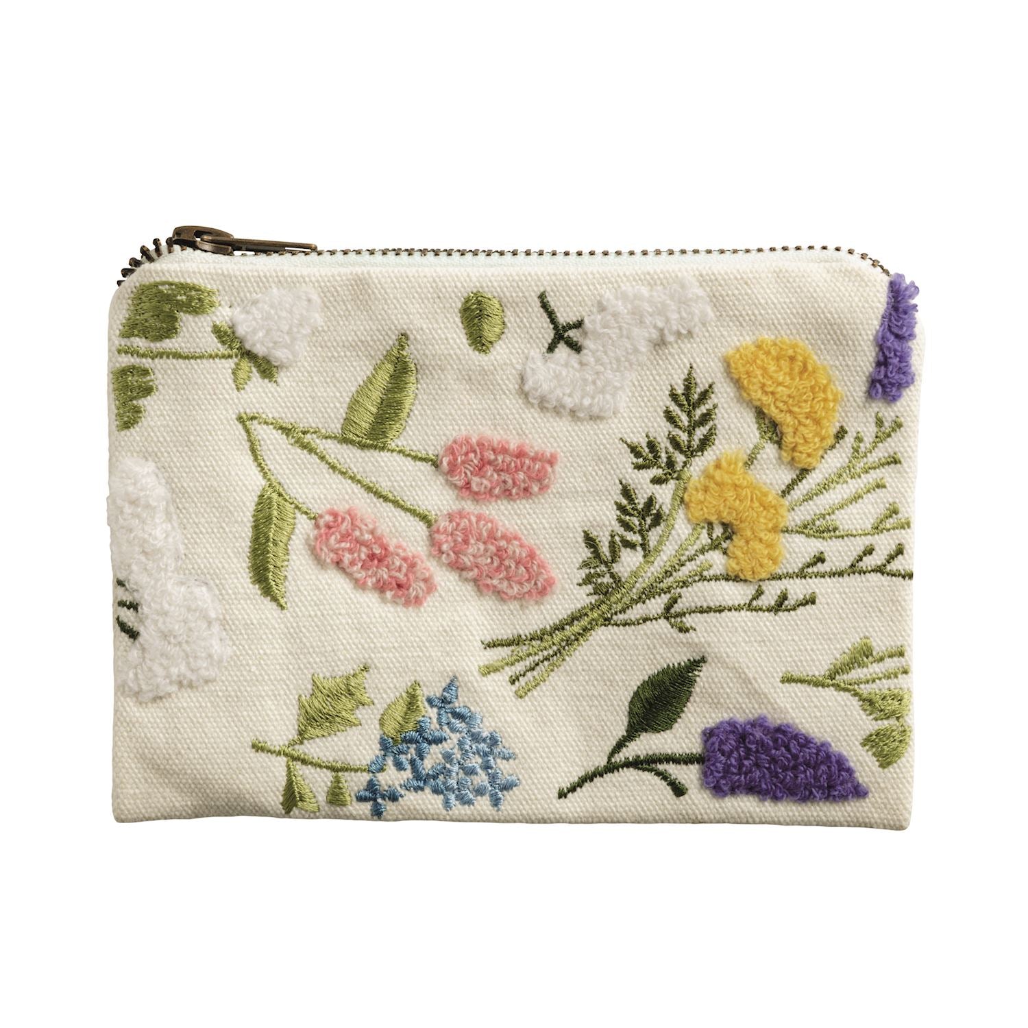 Cotton zipper pouch by Mudpie features embroidered flowers spring flowers in vibrant colors.