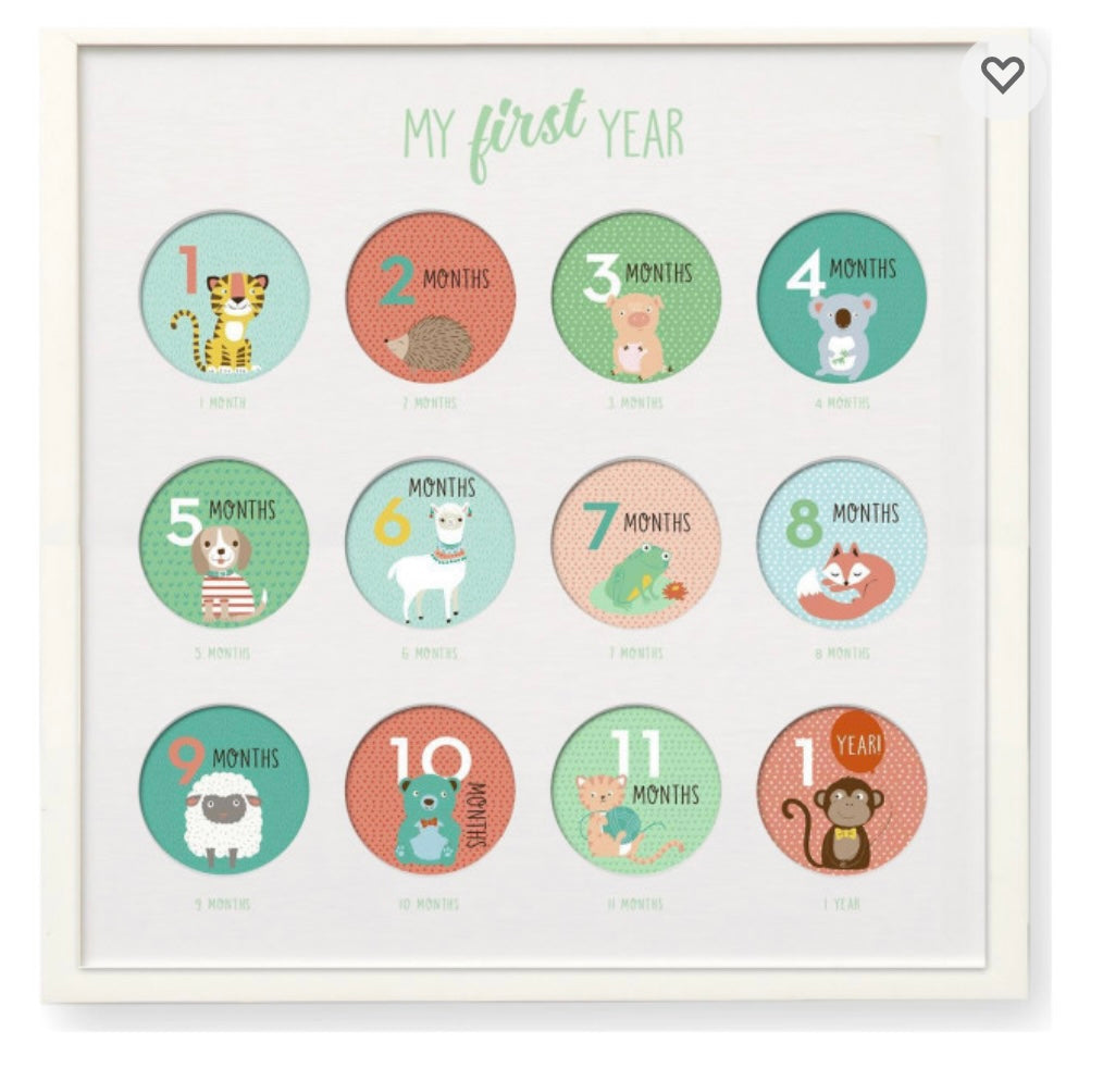 For a thoughtful shower gift or to delight new parents, look no further-this 18-inch square frame has a spot for each of the first 12 months and includes an adorable 'age' sticker to put on the baby before the photo sessions. Adorable!