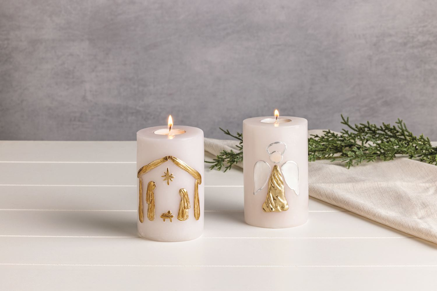 Gold Angel Refillable Candle Set offers a touch of elegance and serenity to any space. This features a beautifully hand-painted resin pillar, designed to hold a standard tea light, creating a warm and inviting ambiance. The intricate detailing of the angel design adds a heavenly charm, making it a perfect decorative piece for any room. With the ability to easily place and replace the tea light, you can enjoy limitless hours of candlelight, enhancing your home with a soft, flickering glow. The set includes a standard tea light, ensuring you can start enjoying its beauty immediately. Measuring 4 1/2" in height and 3" in diameter, this resin candle holder is a stunning addition to your decor, ideal for creating a peaceful atmosphere or as a thoughtful gift for loved ones.