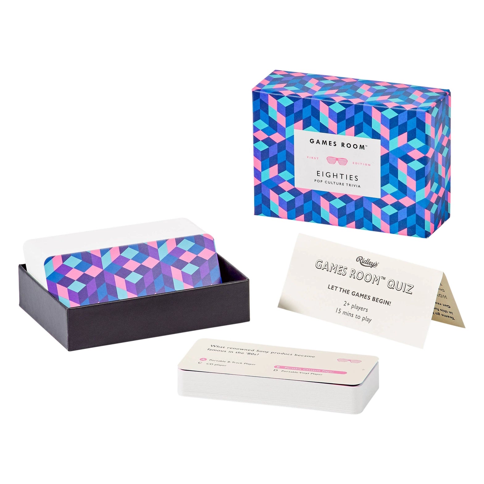 Pull up your leg warmers and fire up the DeLorean because we're heading to the 80s with this 80s Pop Culture Trivia from Games Room! Who will be on the A-Team and who'll be on Team Betamax? From questions about Super Mario and Street Fighter to Madonna and Ghostbusters, put your knowledge of the decade to the test! Packaged in a geometric print box, the set contains 140 question cards and instructions.