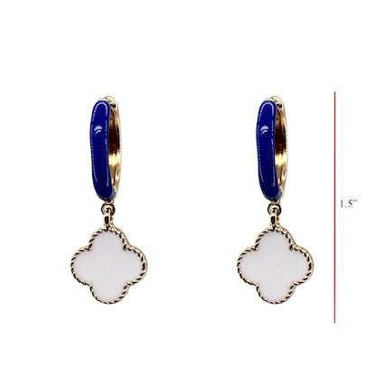 1 1/2in BLUE ENAMEL HUGGIE EARRING WITH WHITE CLOVER DANGLE