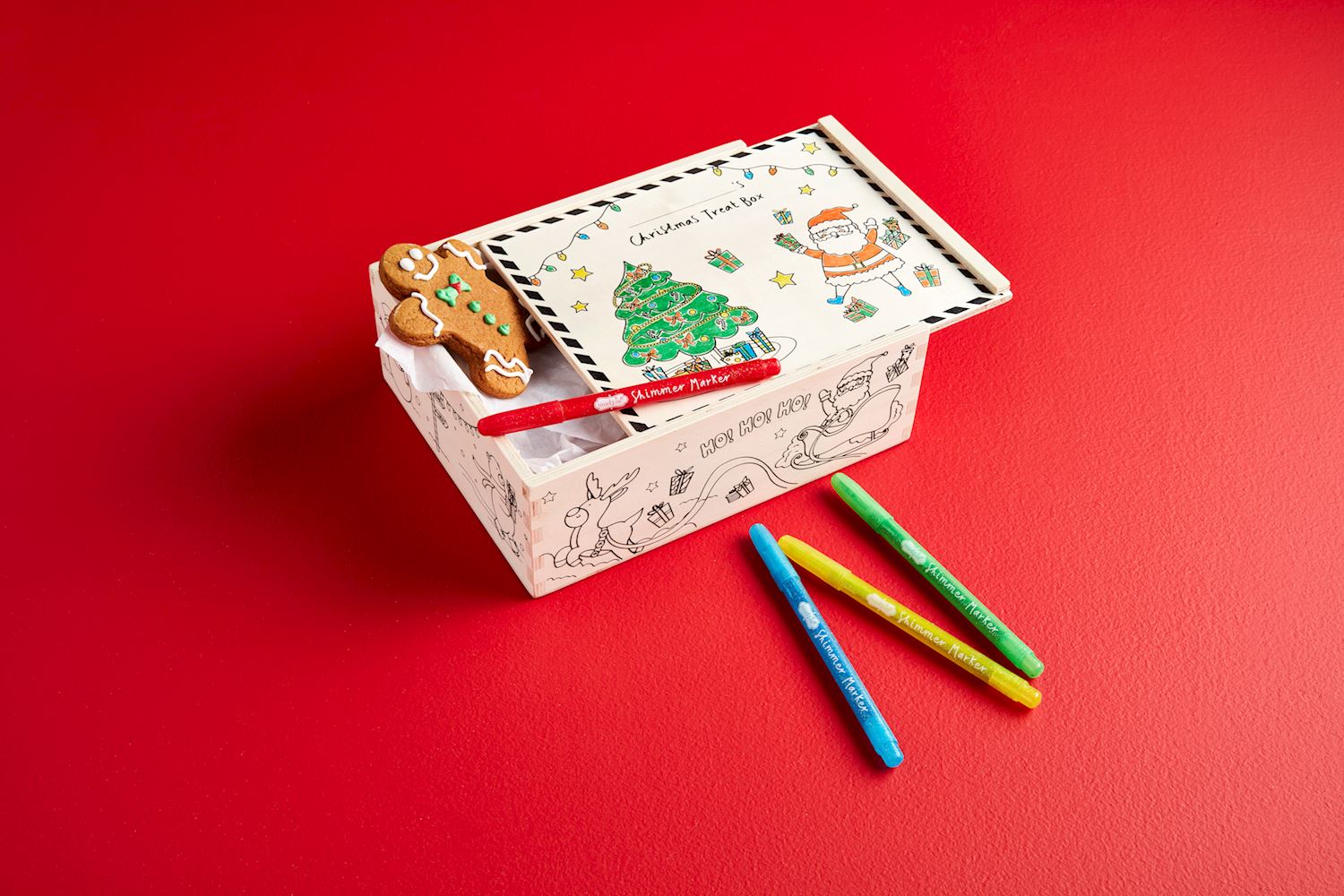 2-piece set. Wood box comes with markers for child to decorate their very own holiday treat box. Fill the box with small surprises throughout the season and leave it for them to find.