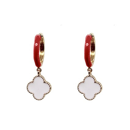 1 1/2in CRIMSON ENAMEL HUGGIE EARRING WITH WHITE CLOVER DANGLE