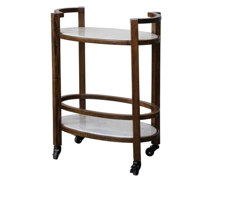 A stylish and functional bar cart that features a mango wood frame and two marble shelves in walnut finish and white color.