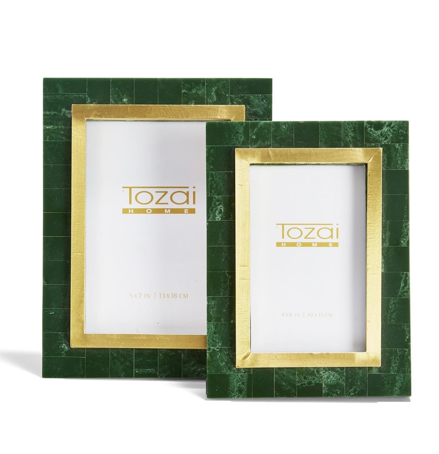 These beautiful frames are created with layered green resin giving it additional depth. Finished with an inner rim of gold these elegant frames are the perfect way to highlight your photos.