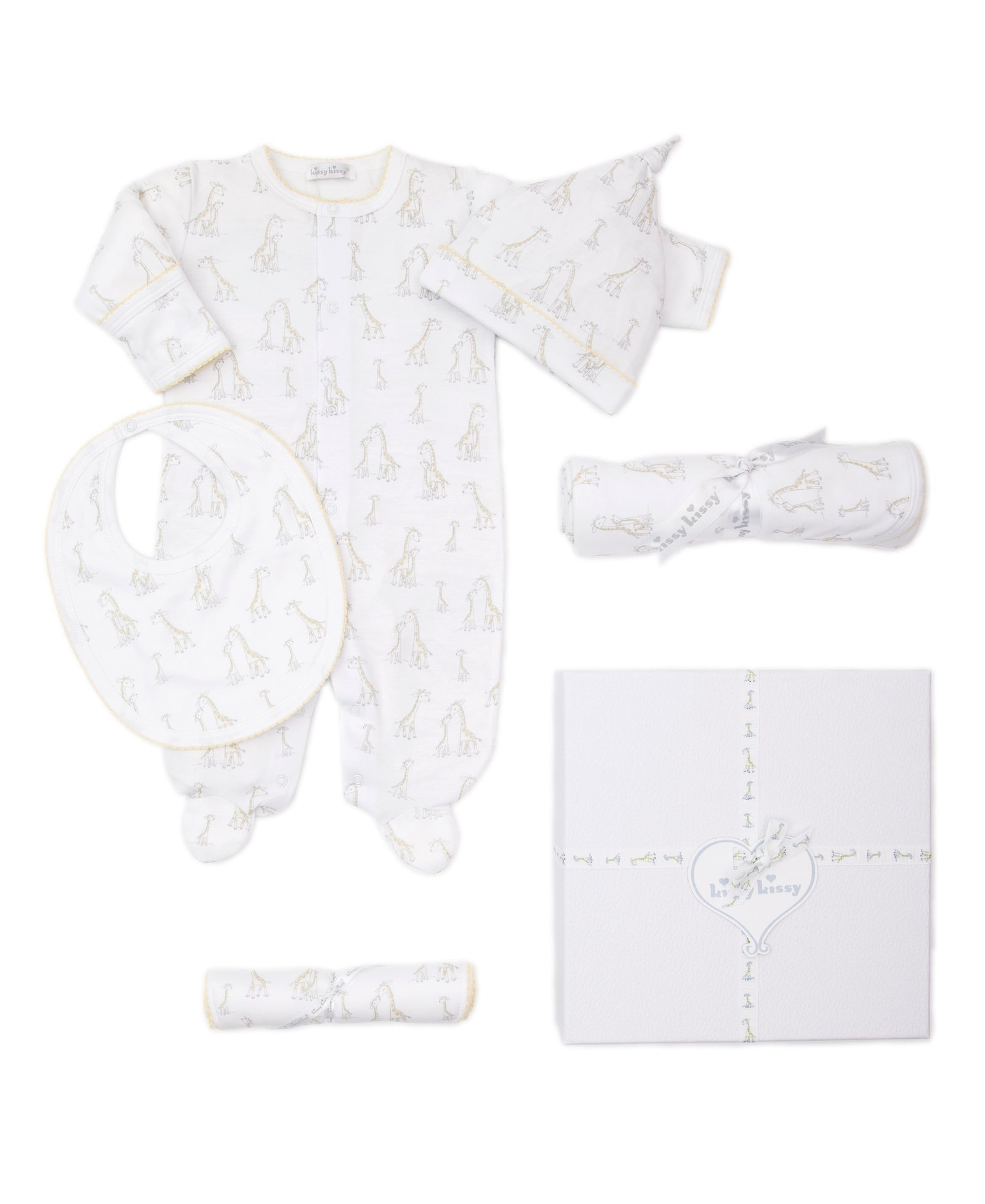 - Welcome baby home with this 100% Pima cotton, Kissy Kissy favorite: Giraffe Generations Collection print gift set. This 5-piece take me home gift set includes a footie for sleep or play with a matching cozy hat, a bib & burp cloth and a coordinating, softer than softer heirloom quality blanket. All items are elegantly folded and placed in our branded gift box, wrapped in printed ribbon detail.