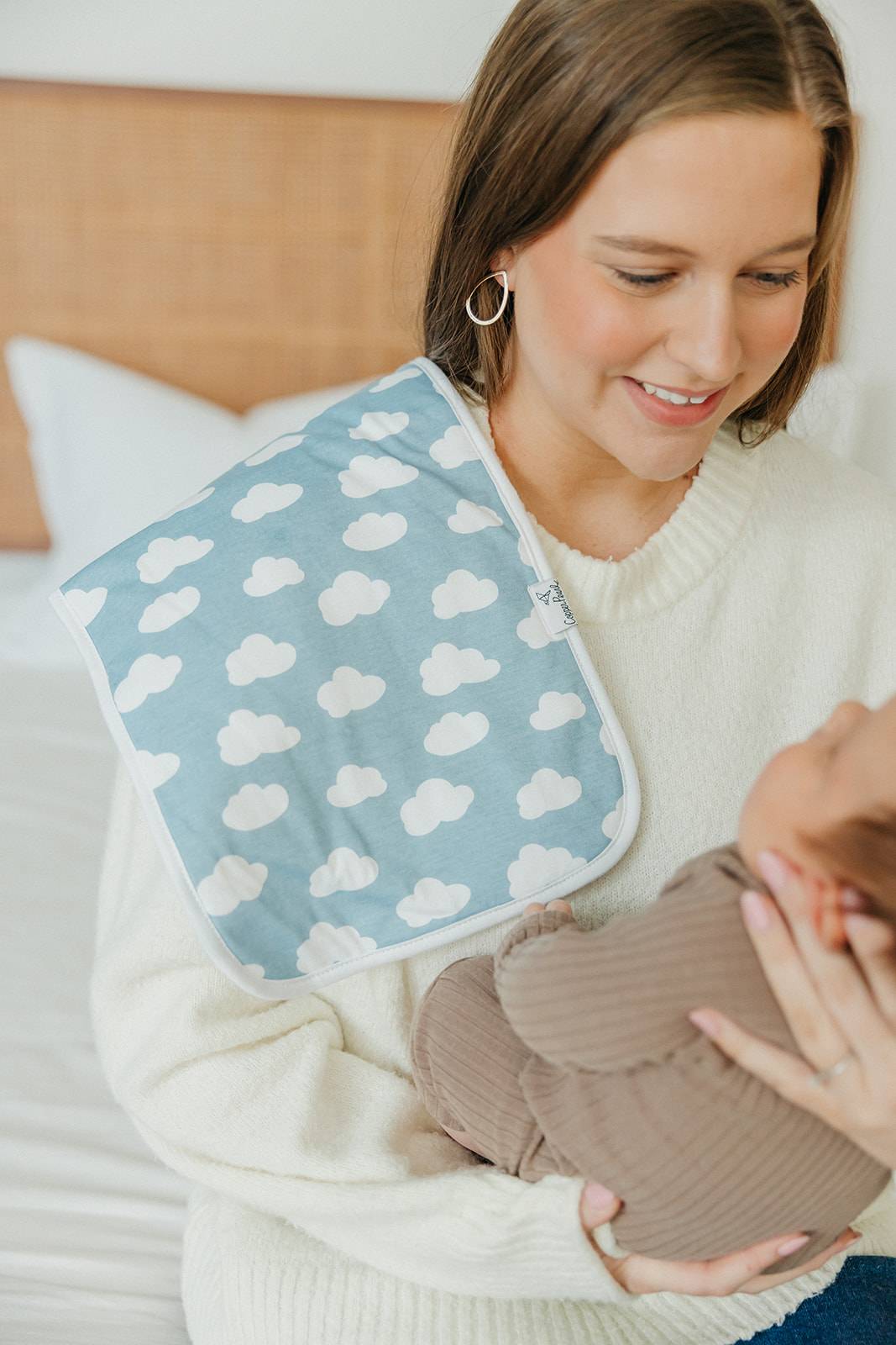 Our burp cloths are designed with baby’s comfort in mind. That’s why we created them with 100% ultra-soft cotton layers on the front (patterned) and back (plain white). You can feel confident that baby will feel cozy against your shoulder while burping.