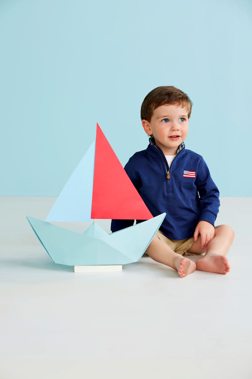 Embroidered interlock pullover features quarter zip neckline with gingham lining and side vent hem.