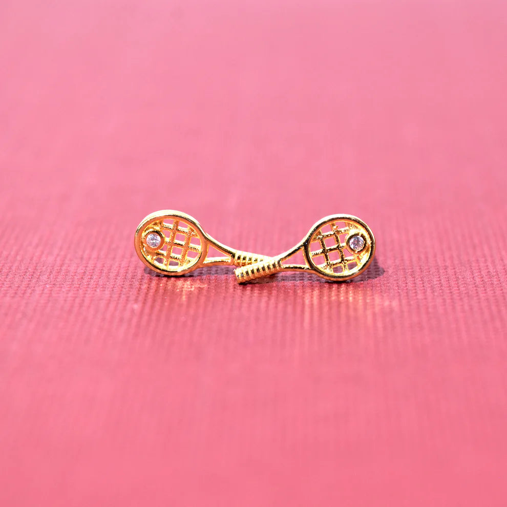 Now serving, dainty & darling tennis racquet earrings. Made of .925 sterling silver, these little racquets feature a tiny cubic zirconium tennis ball. Allergy free push back post closure. Earring dimensions = .5"H x .25"W.