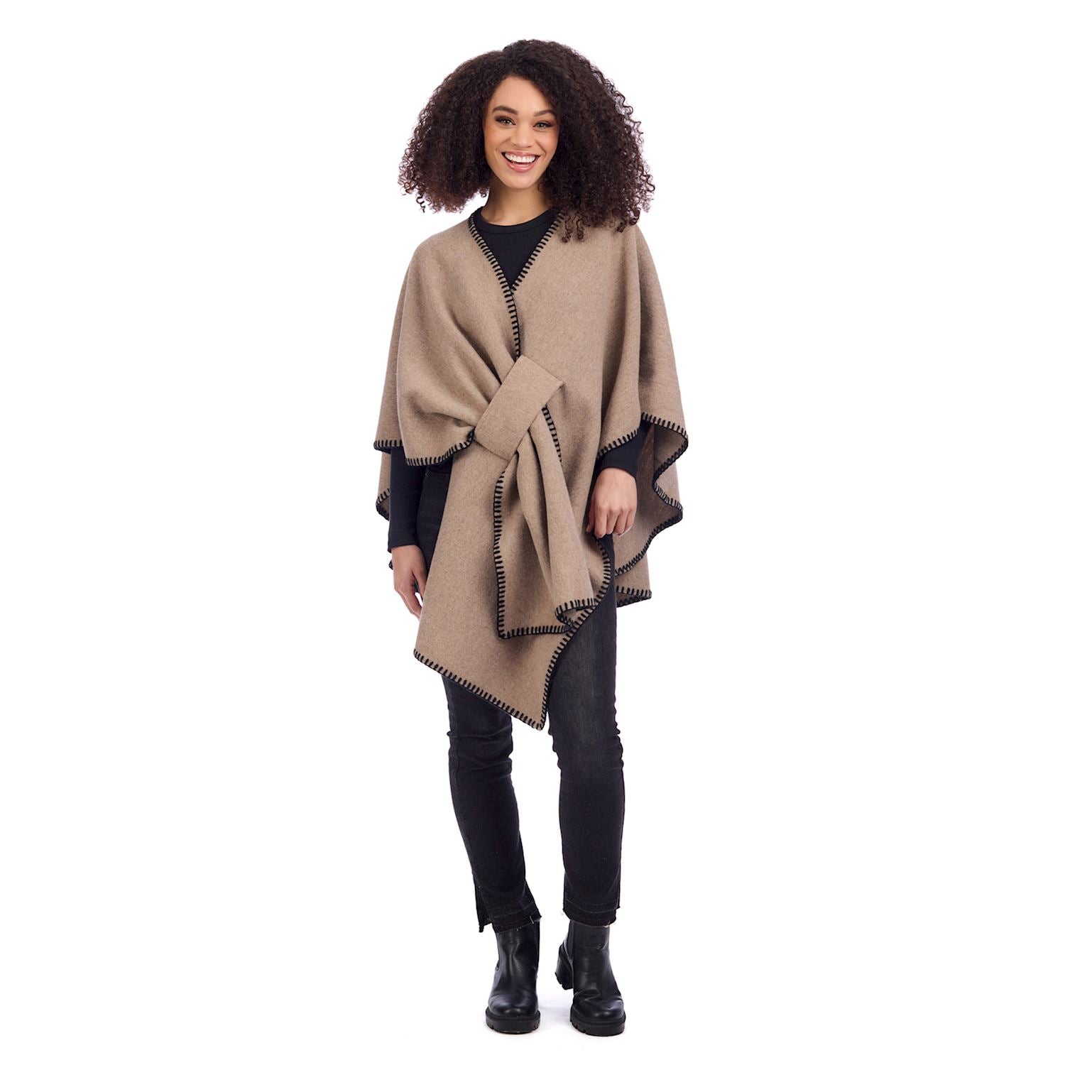 Heathered polyester felt poncho features contrast blanket stitching and pull-through loop front closure. One size fits most. Measures approximately 31 1/2" from shoulder to hem.