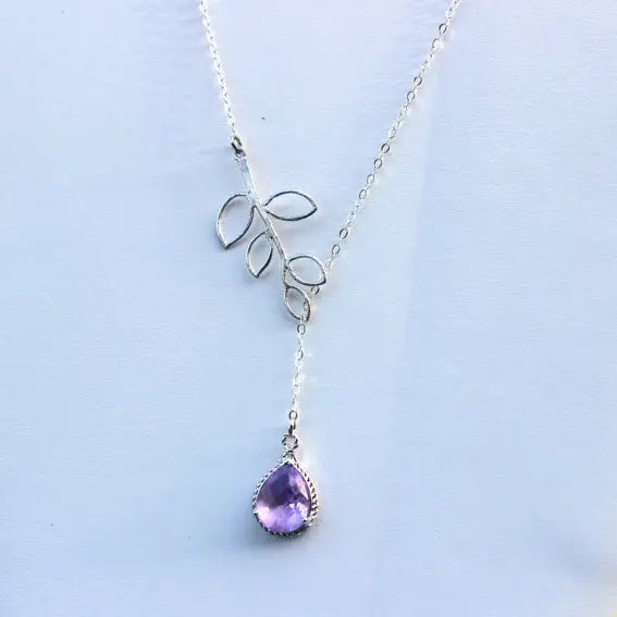 The lavender teardrop measures overall 19mm by 12mm (including the loop). The glass in the middle of the teardrop measures 13mm by 10mm by 6mm. The chain is sterling silver and measures 2mm X 1.4mm. It is a flat cable design. The length of this particular necklace is approximately 14 inches. The leaf measures 18mm x 39mm. You are sure to stand out in this beautiful necklace!