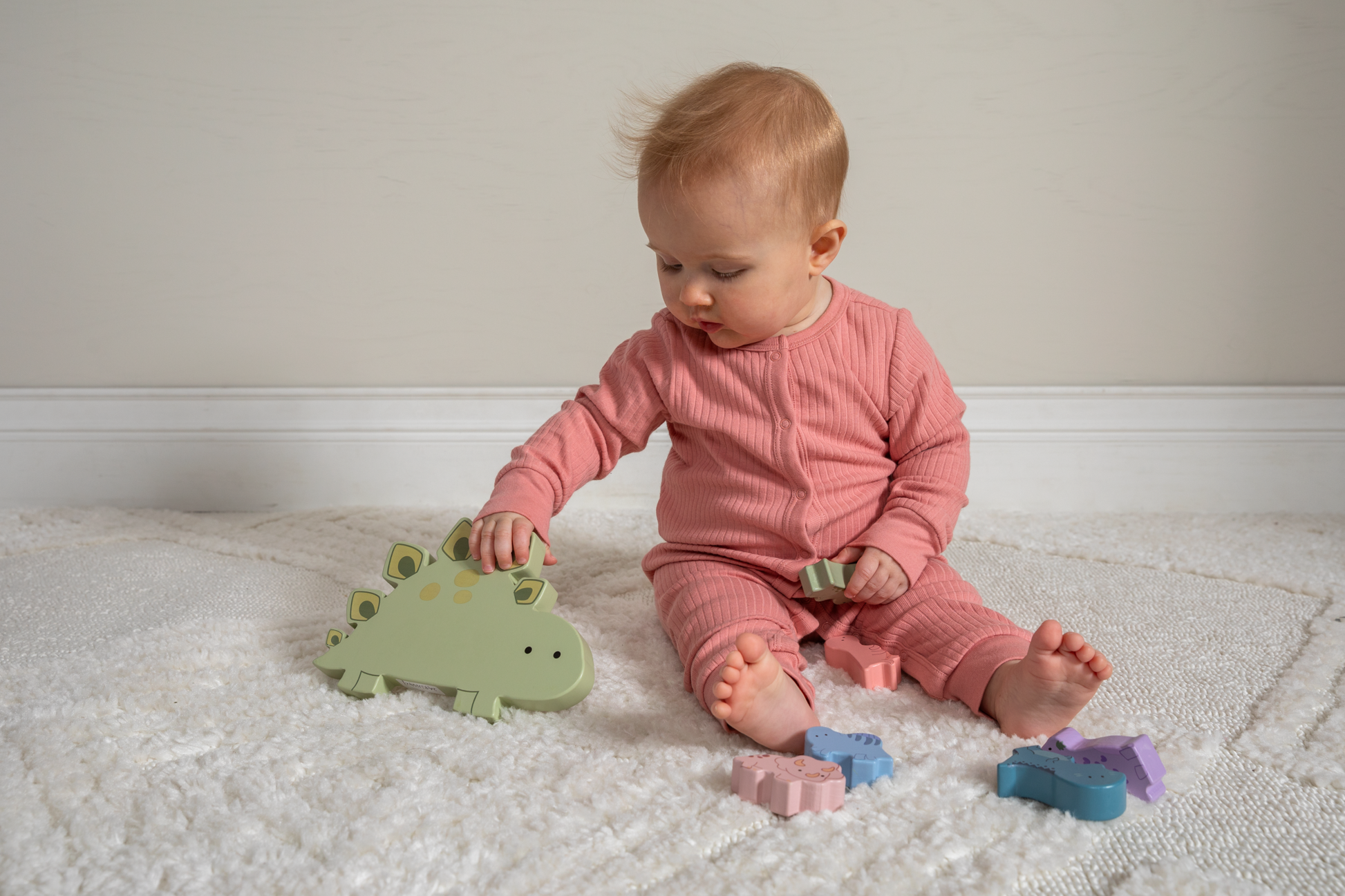 Our wooden dinosaur block set includes 7 pieces in soft shades of greens, blues, and pinks. Each block features different dinosaurs, offering a fun activity for little ones. Made with high-quality materials, these blocks are durable and perfect for playtime. Ages 18Mos+