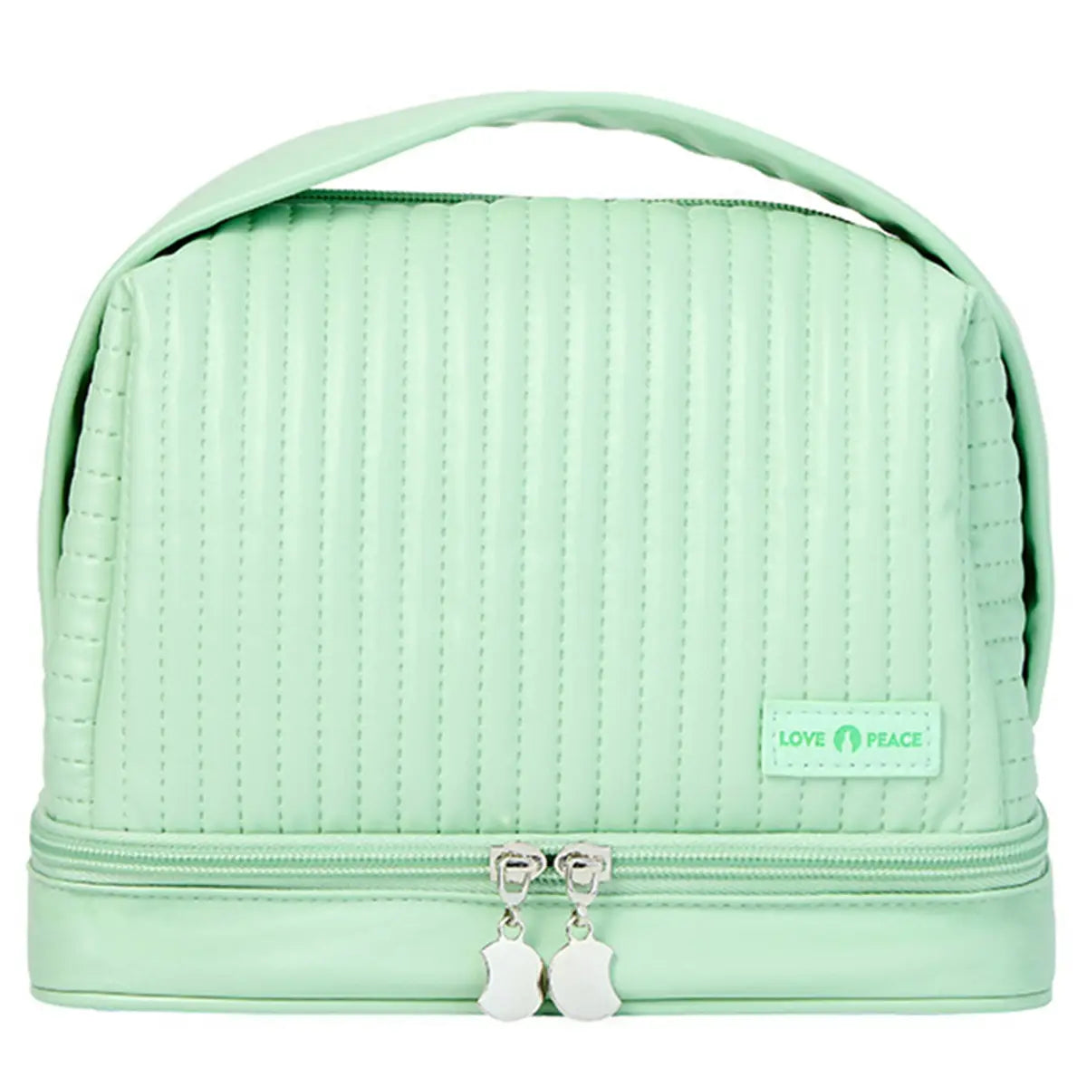 This makeup bag features a top and bottom zipper compartment. Perfect for keeping your essentials organized.