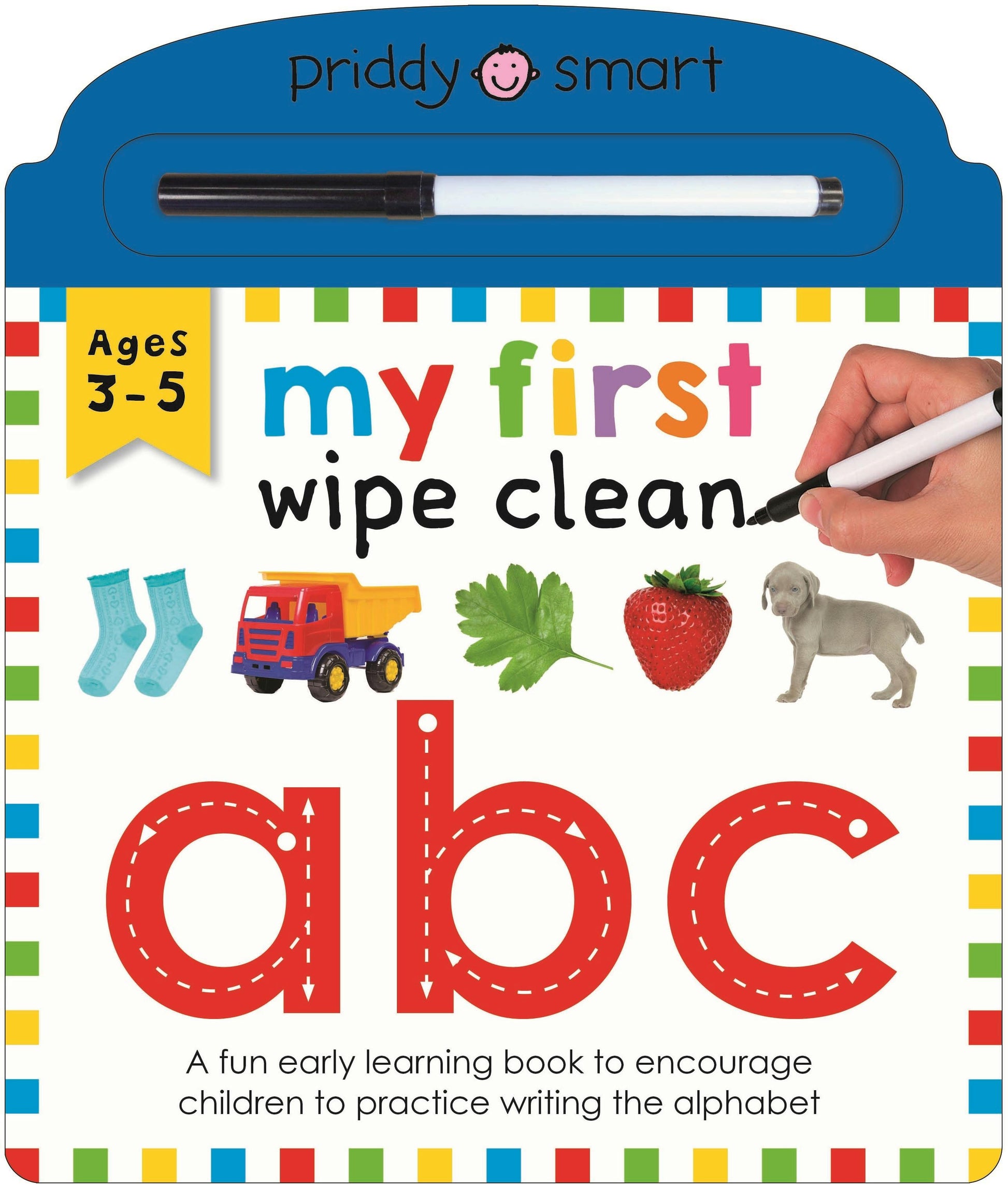The sturdy board pages and bold, colorful design make it a fun learning tool, and the wipe clean pages mean children can practice writing the alphabet again and again. It also comes with its own dry-wipe pen that is stored neatly at the top of the book.