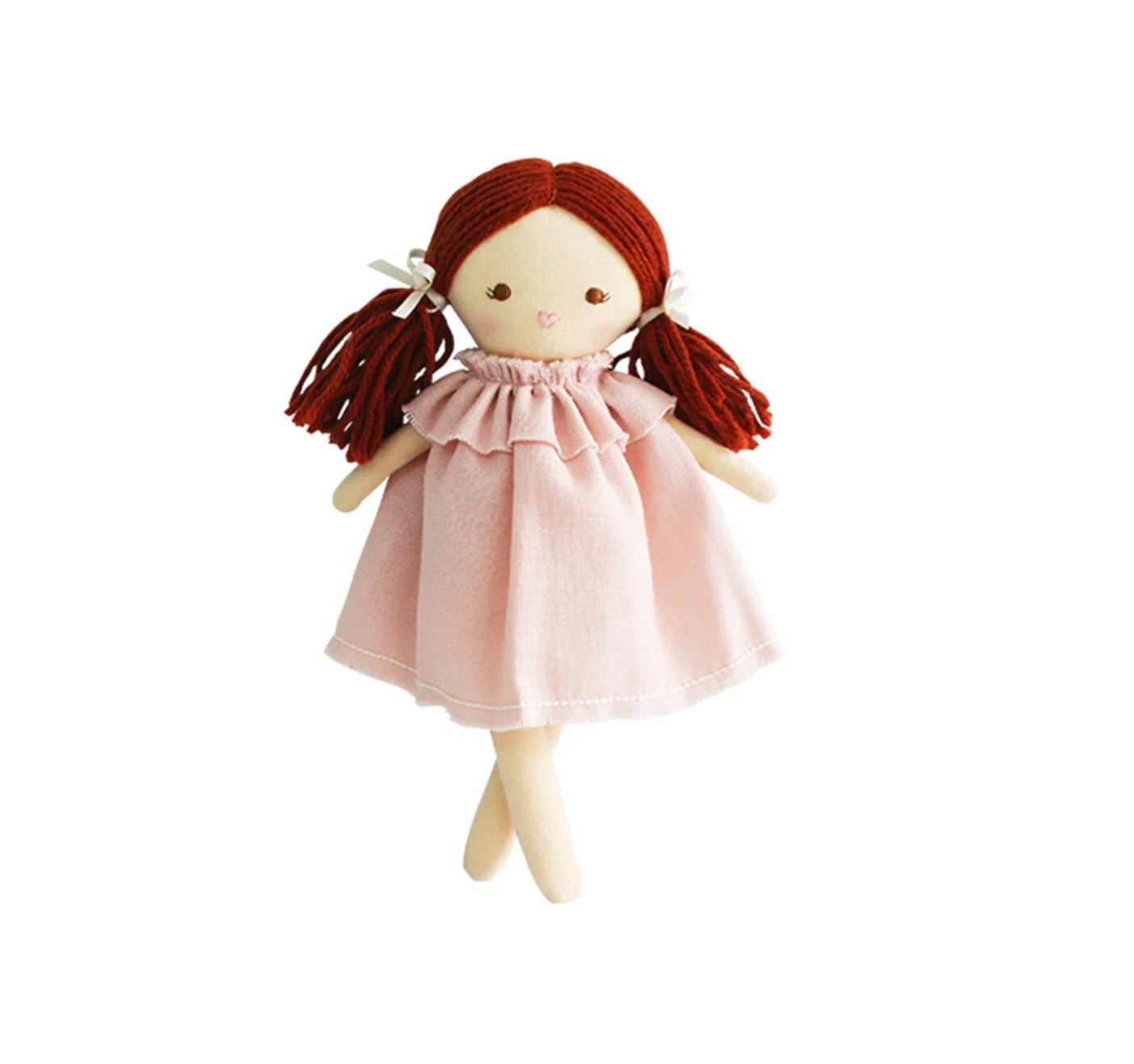 Matilda is a 9 inch linen doll with auburn yarn pigtails. She wears a solid pink linen dress and black hair bows. A heart shaped stitched mouth, a touch of blush and brown stitched eyes and eyelashes create an adorable little friend for your littles