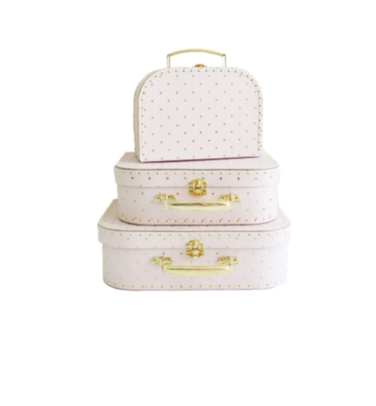 A very sweet set of children’s suitcases by Alimrose, this baby luxury accessory makes a good storage for baby essentials, as a room decor, and/or for play time or travel purposes. baby. This baby luxury accessory has a great quality handles and stitching. Alimrose Kids Carry Case Set on a very Pretty pale pink and gold spot design could be a nice and fine baby luxury accessory option for you and your