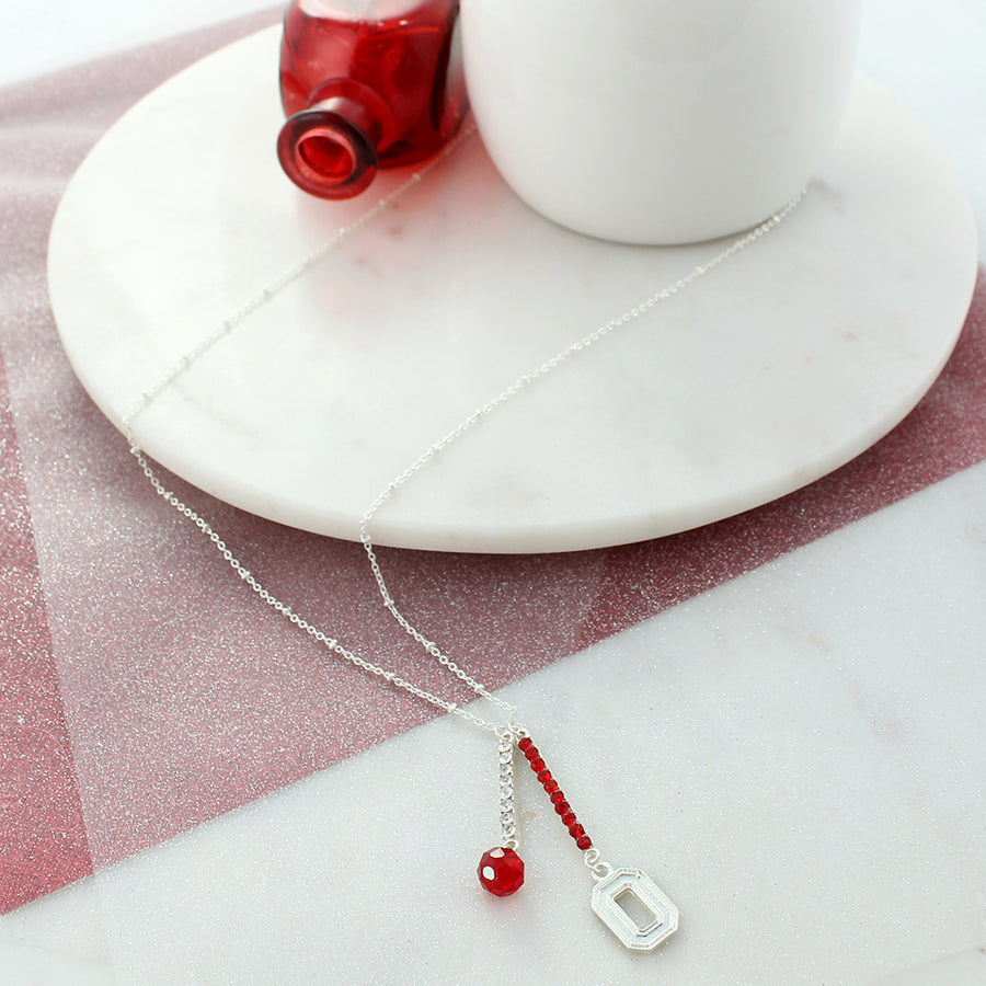 32” in length (with a claw clasp and 2” extender), this silver tone chain necklace features two bars of red and clear crystals with a silver dangle Ohio State logo charm.