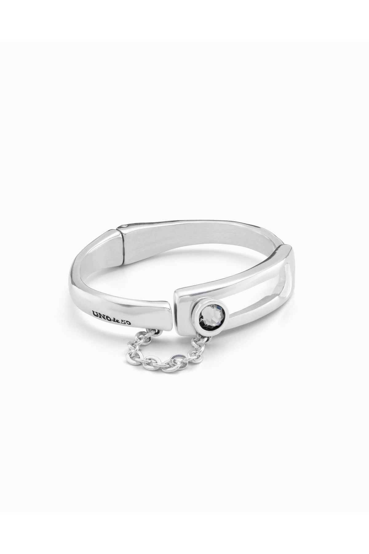 SILVER BRACELET WITH LARGE CENTRAL LINK AND FACETED CRYSTAL JOYFUL|Rigid bracelet with large central link, decorated with a gray faceted crystal and a dangling chain. |The Independent collection represents the feeling of trusting oneself and being proud to be able to do so. Feature in the shape of a jewel through everyday objects with a new value and meaning that breaks any impediment. Symbols of strength. ||This jewel is Made in Spain, 100% handcrafted, achieving a unique design finish.