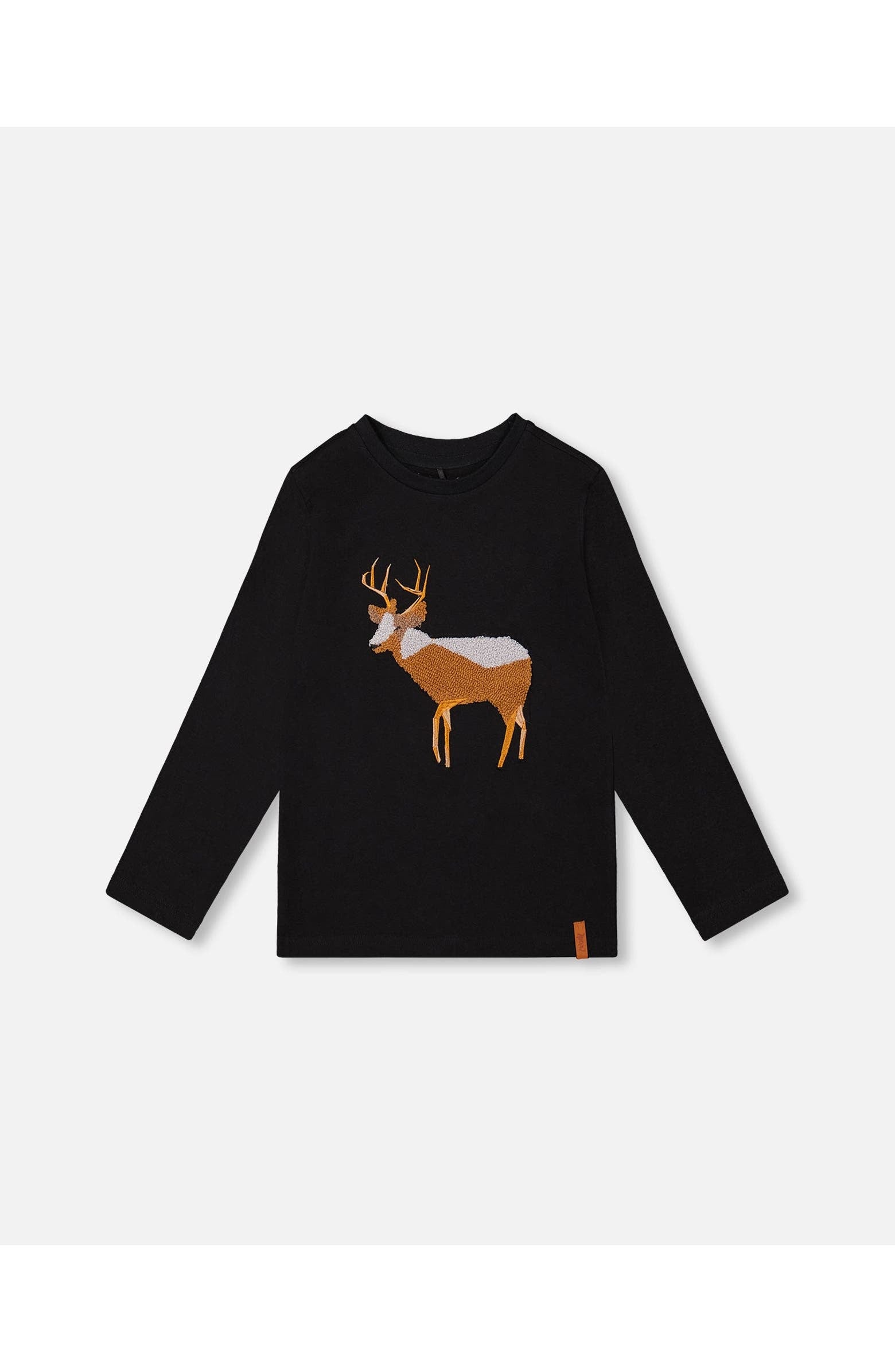 This Organic Cotton T-Shirt Black With Deer brings a stylish twist to a winter classic. Made from soft organic cotton jersey, this long raglan sleeve top features a classic round neckline, and a textured geometric deer illustration in earthy tones for a modern, tactile look. It’s the perfect everyday piece for little boys who love nature and movement.