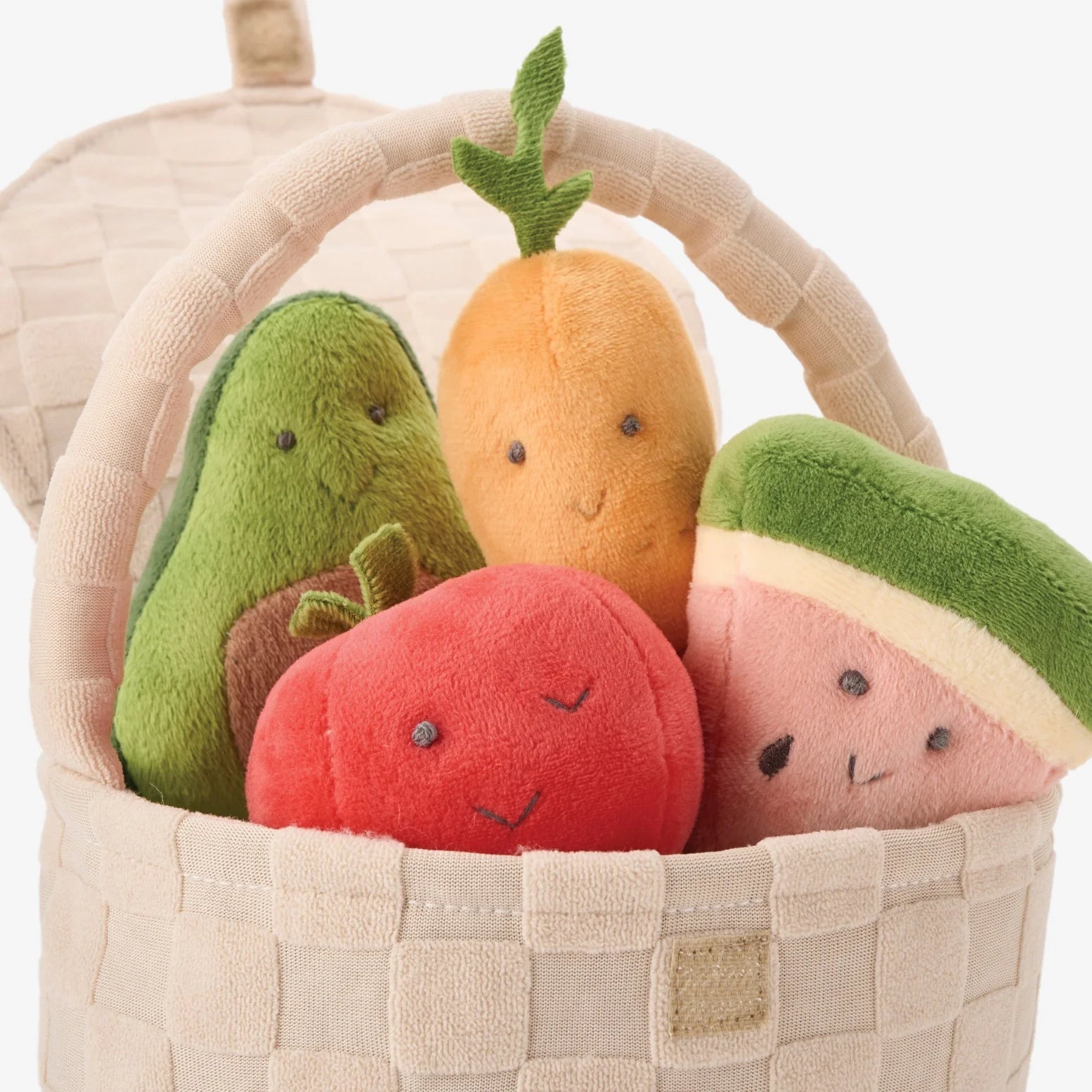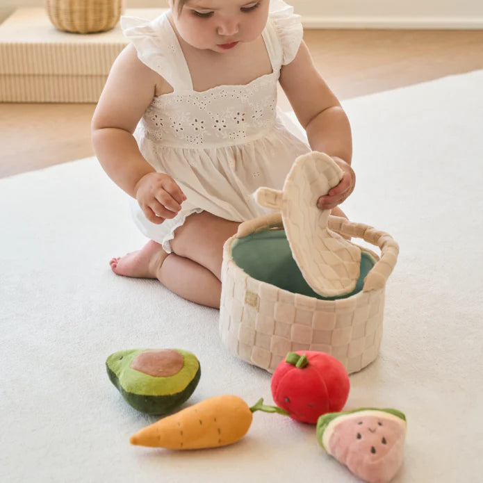 A darling first picnic set for little hands, this plush basket is filled with soft, sensory fruits and vegetable rattles that chime with every shake. Designed to spark imaginative play and introduce healthy eating habits early, it's a charming addition to any nursery or playroom.