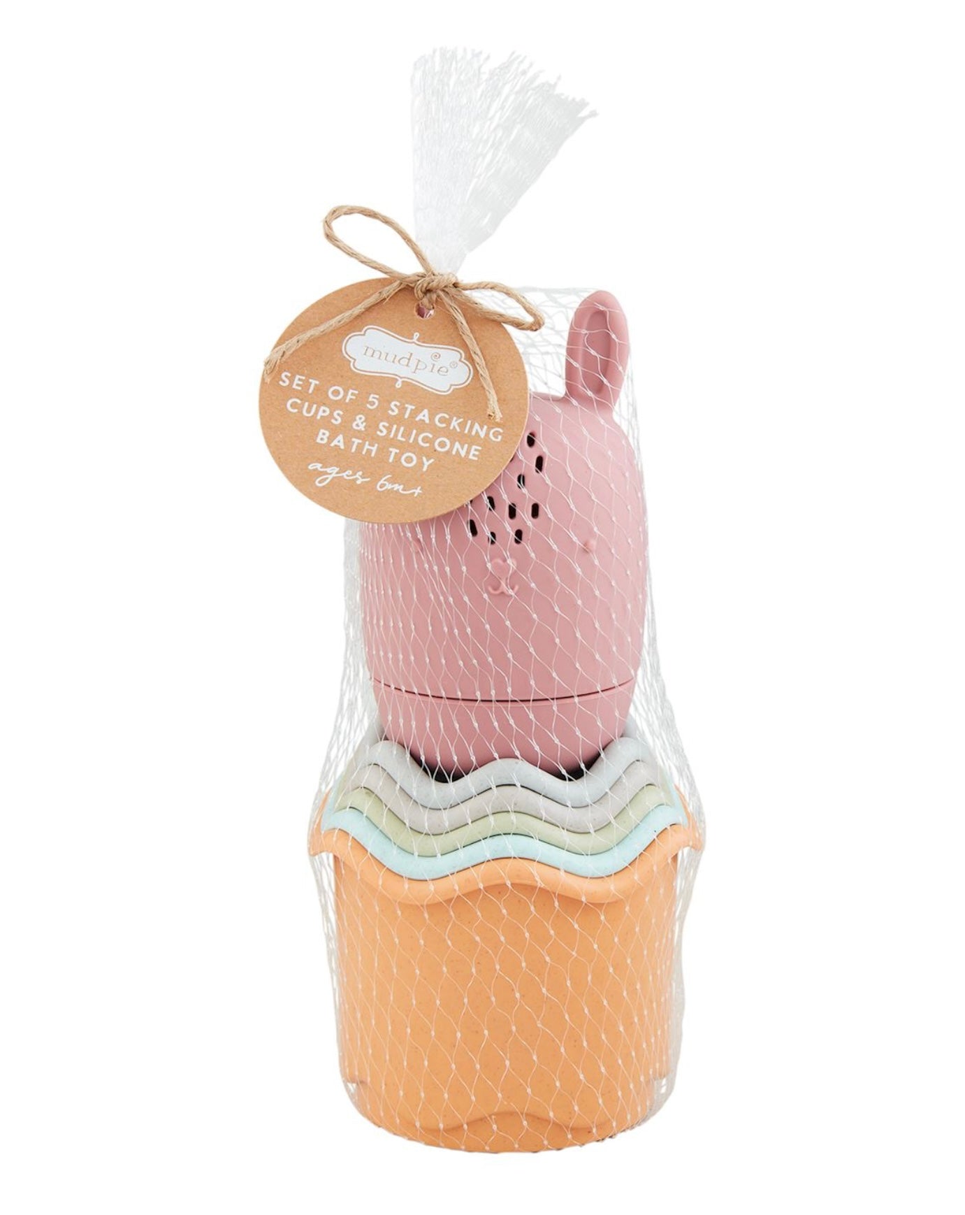 Silicone character bath squirt toy comes with five stacking wheat straw cups.