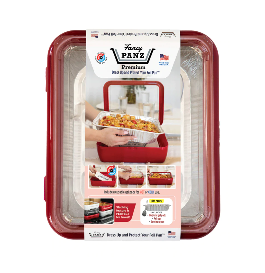 Enjoy all the conveniences of a foil pan and dress it up in a Fancy Panz Premium! No more pans to scrub or dirty serving dish to bring home– just remove the foil pan and wipe down your Fancy Panz!