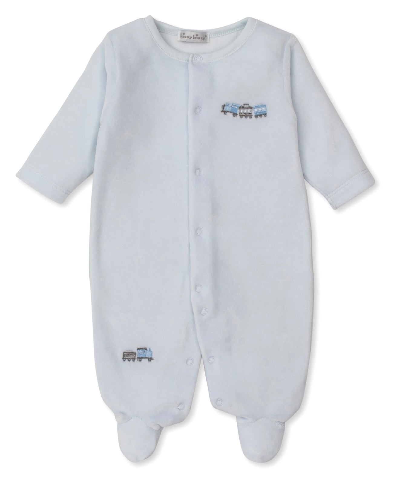 Kissy Kissy Roundabout Railroad Velour Footie Blue 6-9m