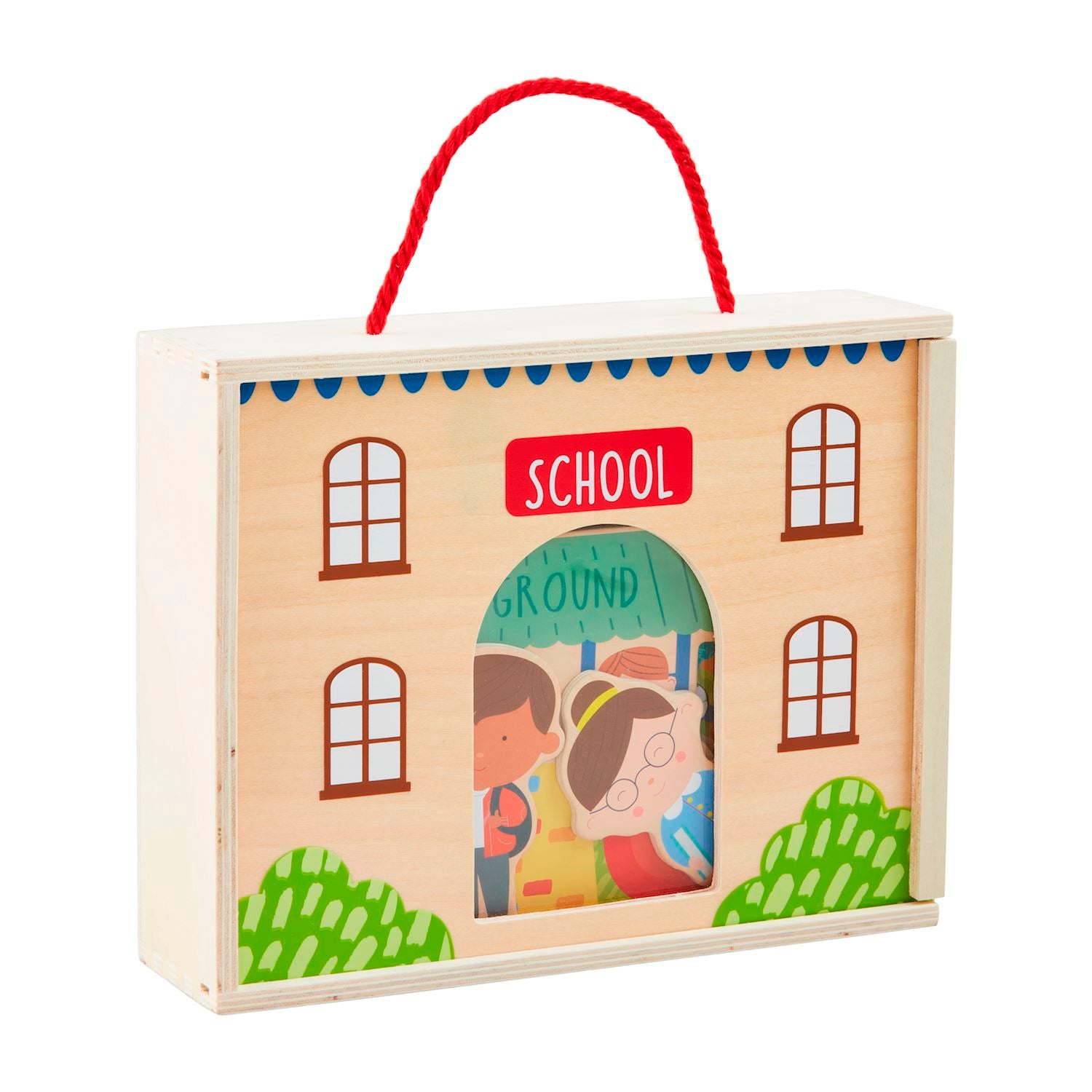 - Includes rolling buses, blacktop road, standing chalkboard, playground equipment, and hopscotch board
