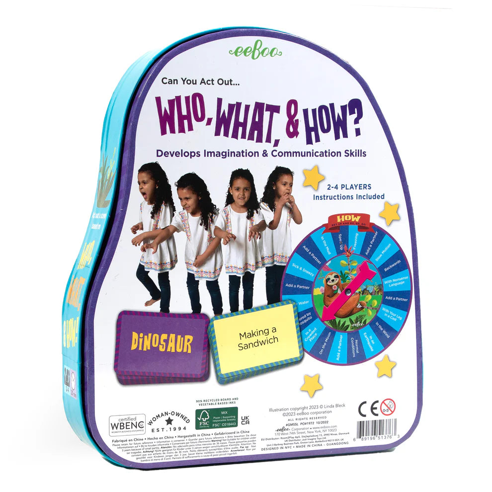 A fast-moving improv game for all ages that combines imagination and a little silliness. A player draws a WHO card, a WHAT card, then spins for HOW, and briefly acts out the combination. Sometimes challenging, always a lot of fun.